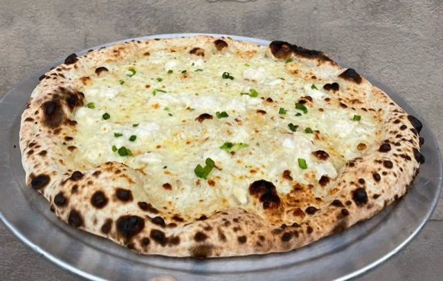 garlic butter cream, wild caught snapper crab meat from Fraser Isle Australia, dry mozz, parmesan, green scallion, backyard lemons